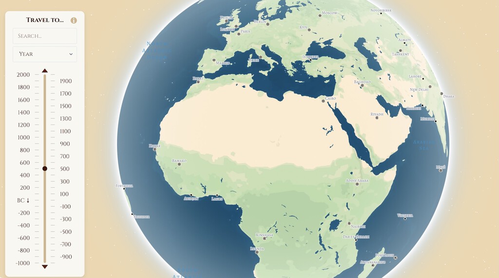 En la web nos encontramos un mapa del mundo que podemos ir deslizando para elegir la zona que nos interesa y también hacer zoom. En la parte izquierda hay una línea donde podemos elegir a qué año queremos viajar, ya sea introduciéndolo o moviendo el cursor, aunque también puedes cambiar la configuración a década o siglo).