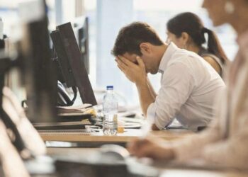 Un maquetador de revista lleva horas frente a su Mac ajustando el diseño de una portada. La pantalla es horizontal....