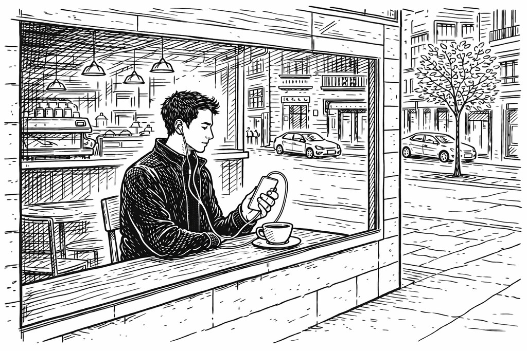 Me acerco a la barra y hablo con el barista. No responde. O responde y soy yo el que llega tarde. Tardo un segundo en entenderlo: llevo puestos unos EarPods con cable, blancos, antiguos, sin cancelación de ruido, sin botones táctiles, sin esa ilusión de control que ahora damos por sentada. Como la vida cuando decides no interrumpirla.