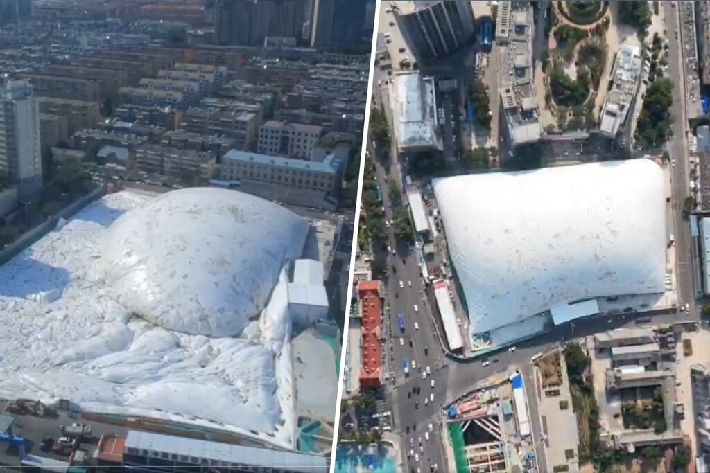 Una ‘catedral’ efímera de 50 metros. La respuesta la desvelaba hace unas semanas Dazhong News: los responsables de la obra desplegaron una gran cúpula inflable de 150 metros de largo, 100 de ancho, 50 de alto y una superficie total que se mueve entre 20.000 y 30.000 metros cuadrados para cubrir las obras. Tal cual. La estructura está formada por una membrana de PVDF, un material muy fino que los operarios desplegaron el 12 de junio con ayuda de ventiladores.