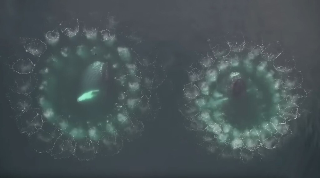 Estos anillos son, en realidad, una sofisticada estrategia de caza que implica la creación de anillos de burbujas para acorralar y capturar tanto a peces como al krill. Las jorobadas nadan en espirales ascendentes mientras liberan aire por sus orificios respiratorios para crear unos vórtices que, en la superficie, vemos como si fueran anillos.